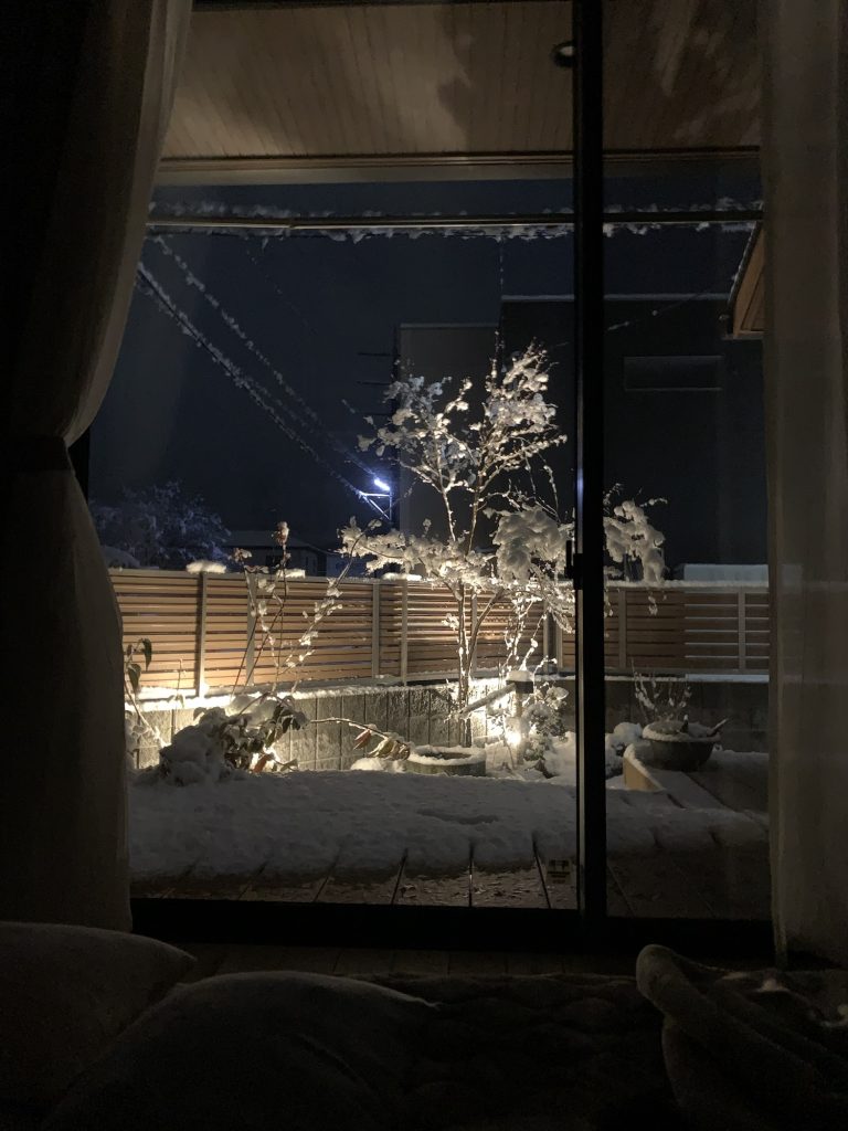 寝室の窓から見える和風の庭に雪が積もる景色は、本当に綺麗です。